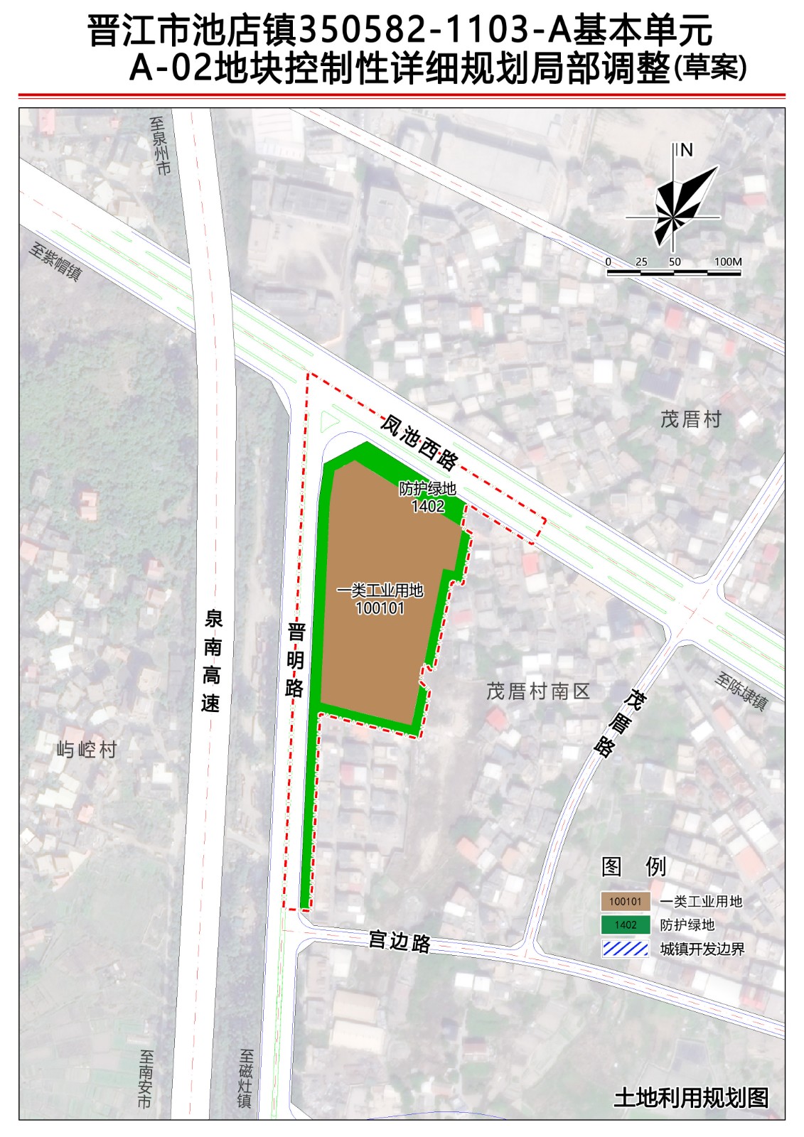 因城市發展建設、國土空間管理和使用需要,組織編制了《晉江市池店鎮350582-1103-A基本單元A-02地塊控制性詳細規劃局部調整》方案。規劃方案于2025年11月6日由我局組織部門和專家評審并審查通過,擬提報晉江市人民政府批準。現根據《中華人民共和國城鄉規劃法》,將規劃草案予以批前公告、征求公眾意見(最終圖紙以批復為準)。具體如下: