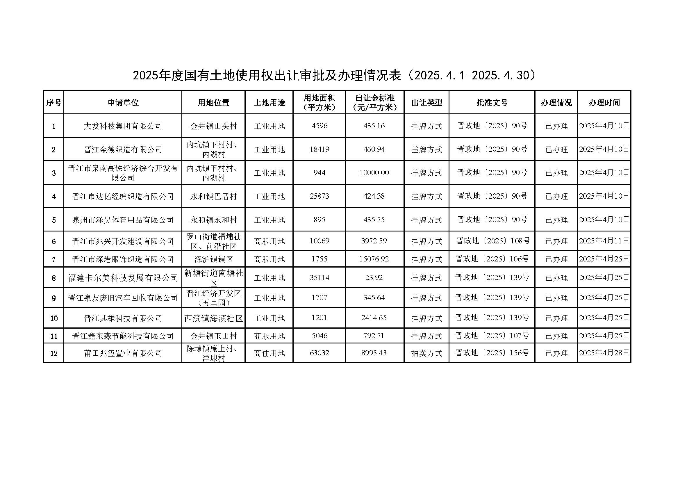 2025年度國有土地使用權出讓審批及辦理情況表(2025.4.1-2025.4.30)