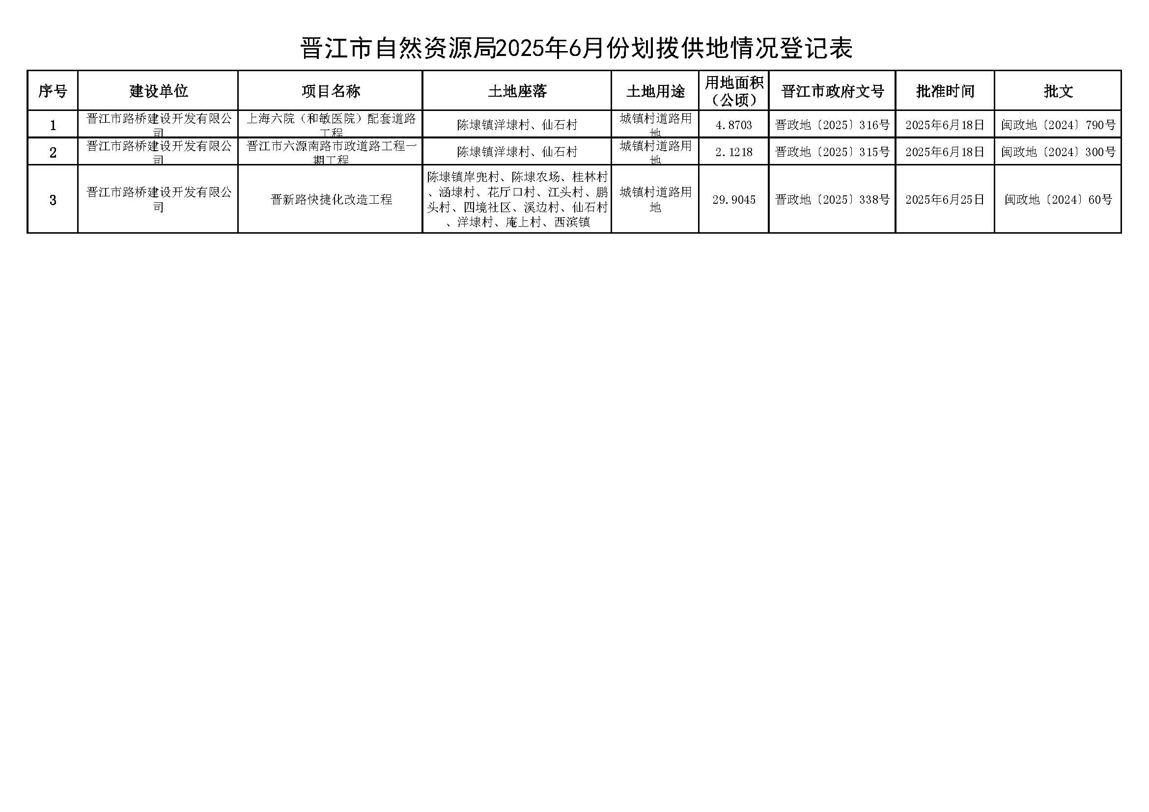 晉江市自然資源局2025年6月份劃撥供地情況登記表