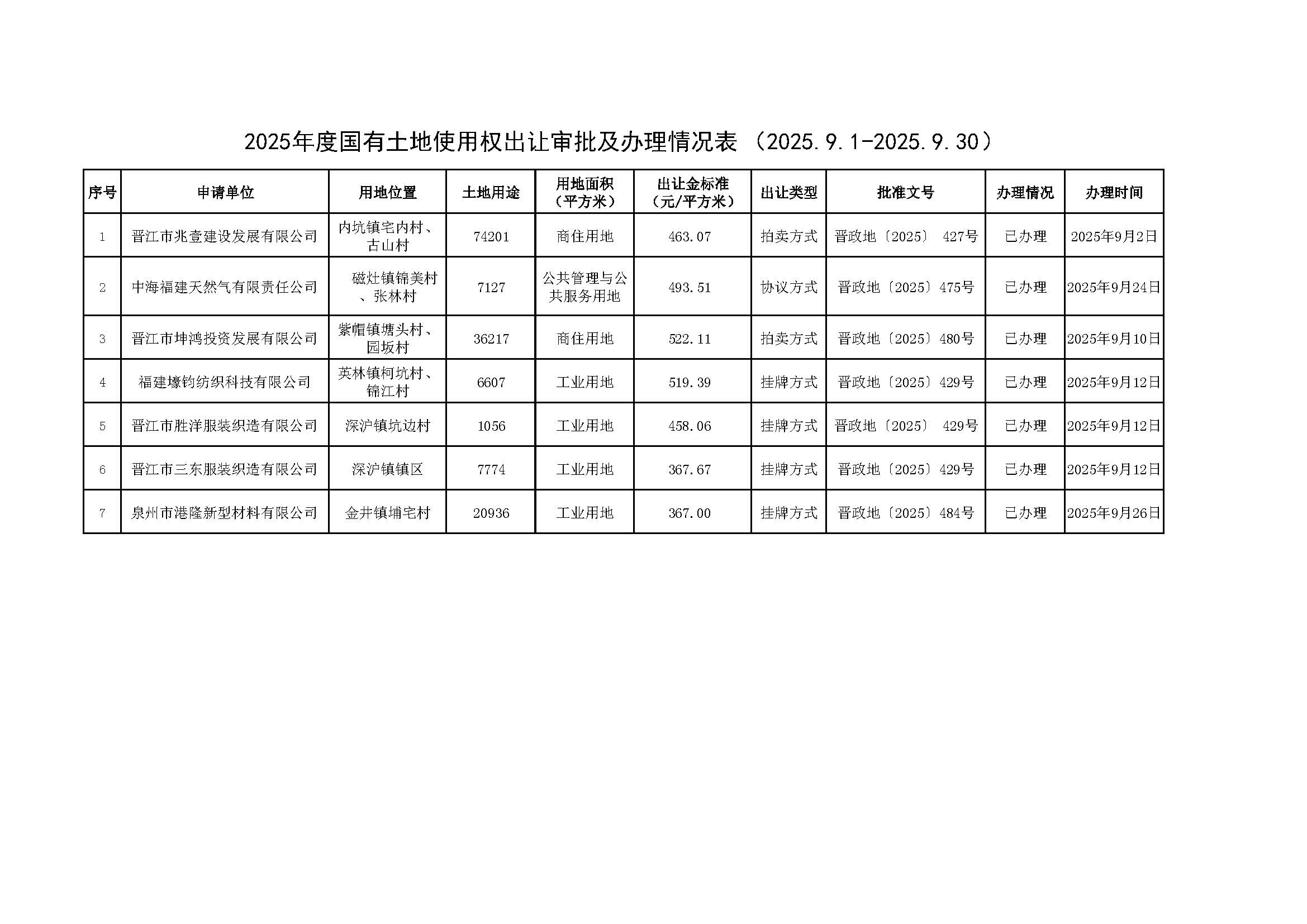 2025年度國有土地使用權出讓審批及辦理情況表(2025.9.1-2025.9.30)