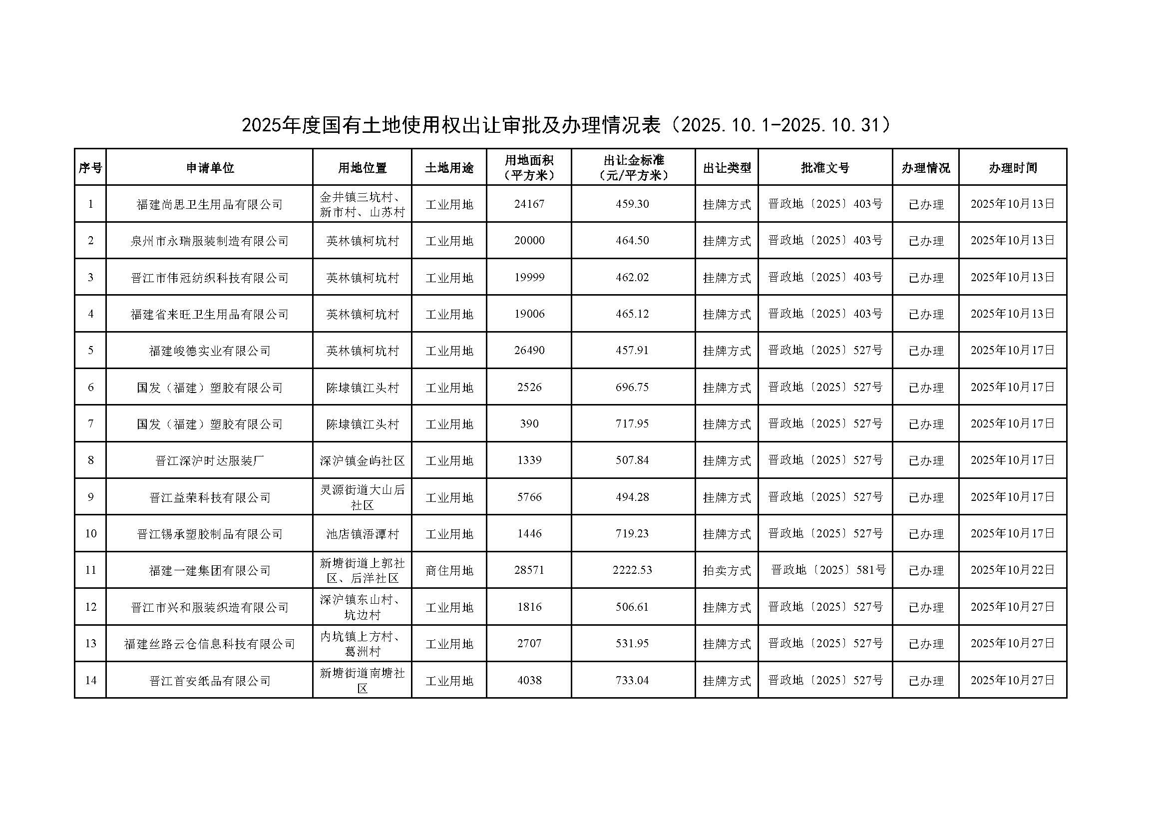 2025年度國有土地使用權出讓審批及辦理情況表(2025.10.1-2025.10.31)