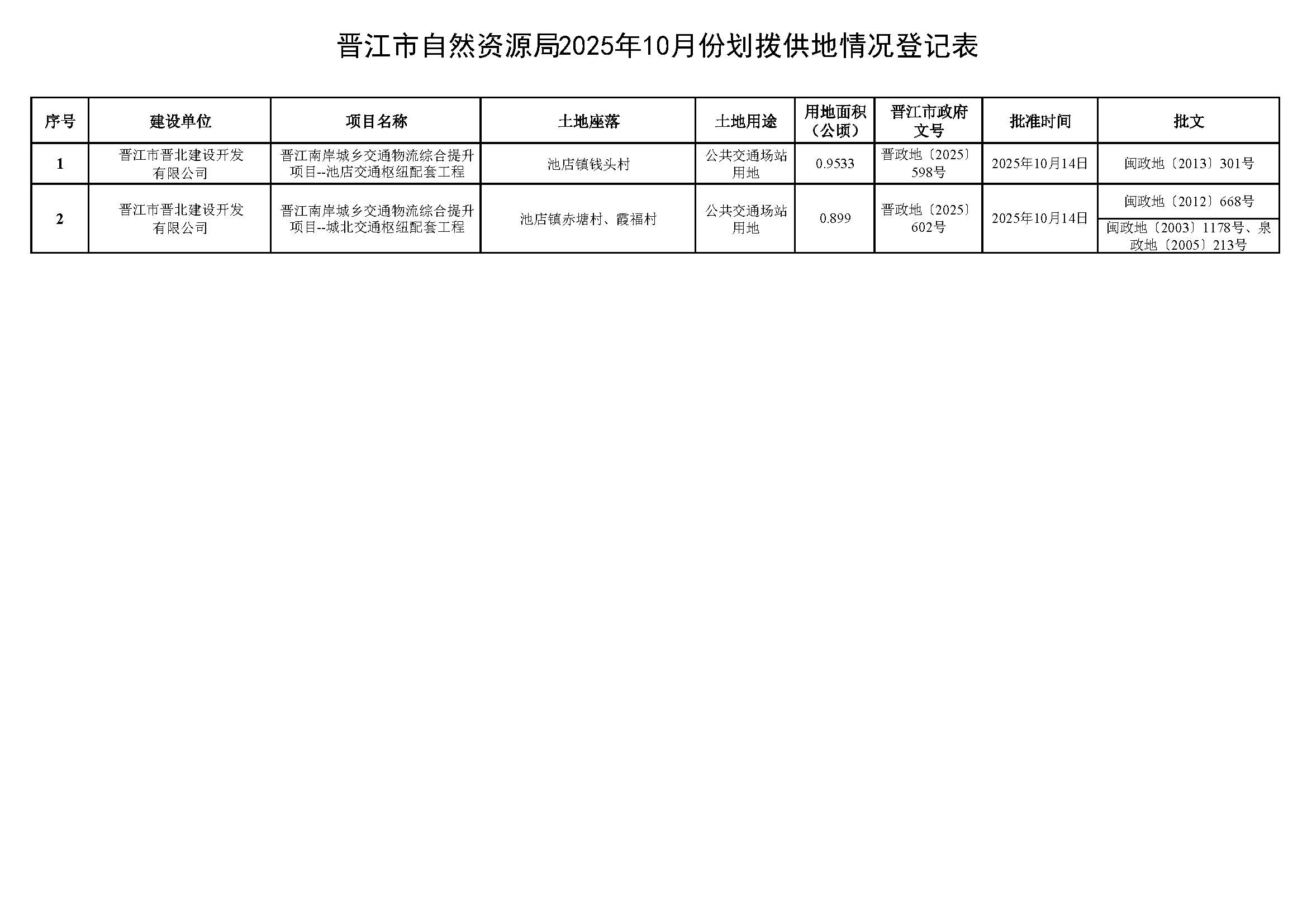 晉江市自然資源局2025年10月份劃撥供地情況登記表